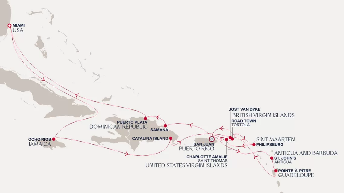 Маршрут круиза: Майами - море - Нью-Йорк - о. Йост-Ван-Дайк - Деше, о. Гваделупа - Бриджтаун, о. Барбадос - Фор-де-Франс, о. Мартиника - Бастер, о. Сент-Китс - Сан-Хуан - Густавия, о. Сен-Бартельми - Сент-Джонс, о.Антигуа - Род-Таун, о. Тортола - Роуд Бэй, о. Ангилья - море - море - Майами