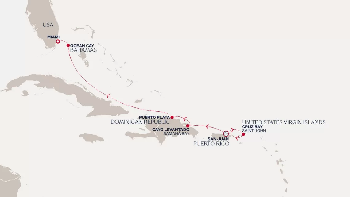 Маршрут круиза: Сан-Хуан - о. Сент-Джон - Нью-Йорк - Нью-Йорк - о. Кайо Левантадо - Пуэрто-Плата - море - о. Оушен Кей - Майами