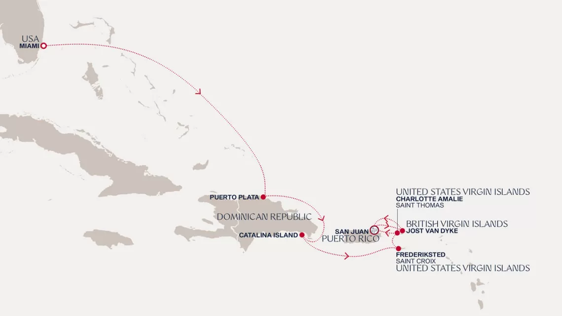 Маршрут круиза: Сан-Хуан - Бастер, о. Сент-Китс - Род-Таун, о. Тортола - Густавия, о. Сен-Бартельми - Густавия, о. Сен-Бартельми - Роуд Бэй, о. Ангилья - море - море - Майами - море - Пуэрто-Плата - о. Каталина - о. Сент-Джон - Нью-Йорк - Нью-Йорк - о. Йост-Ван-Дайк - Бастер, о. Сент-Китс - Шарлотта-Амалия, о. Сент-Томас - Сан-Хуан