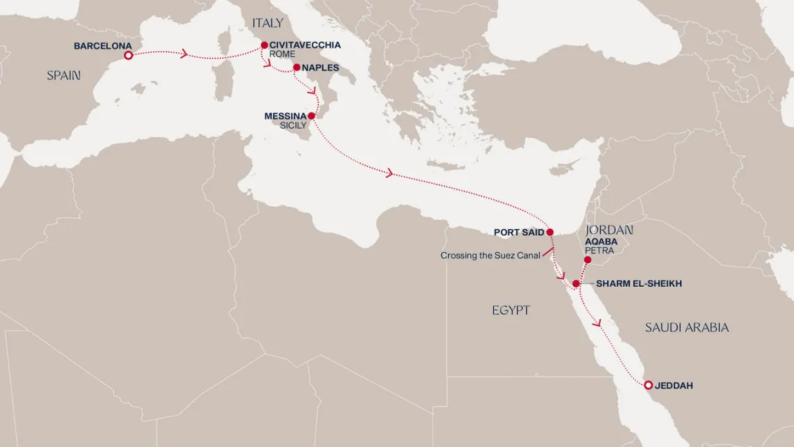 Маршрут круиза: Барселона - море - Чивитавеккья / Рим - Неаполь / Помпеи - Мессина, о. Сицилия - море - море - Порт-Саид - Суэцкий Канал - Суэцкий Канал - Шарм-эль-Шейх - Лимасол - Акаба - море - Джидда