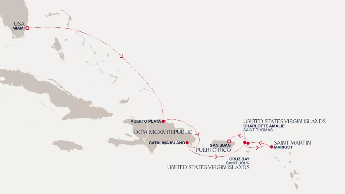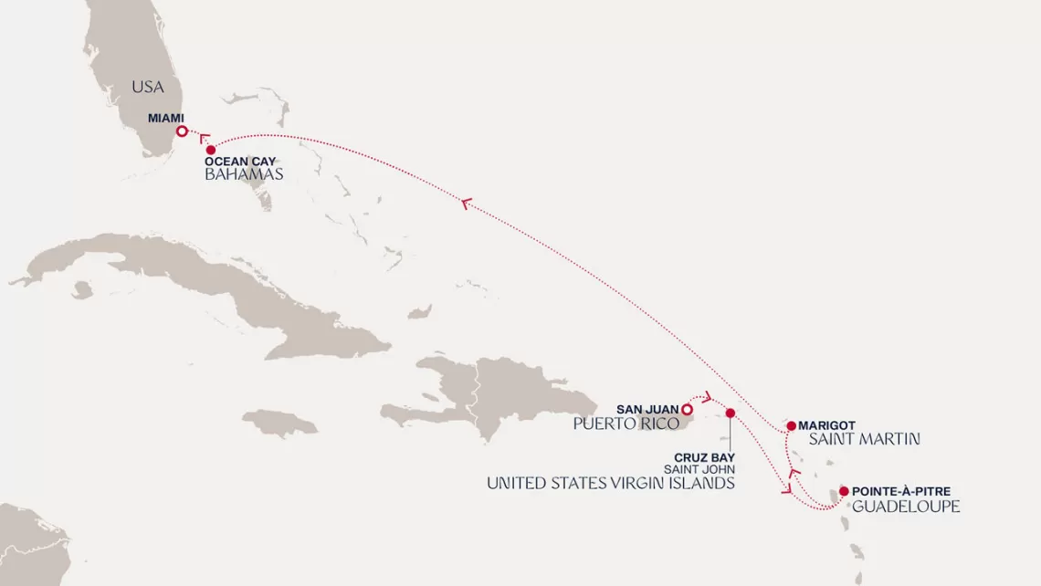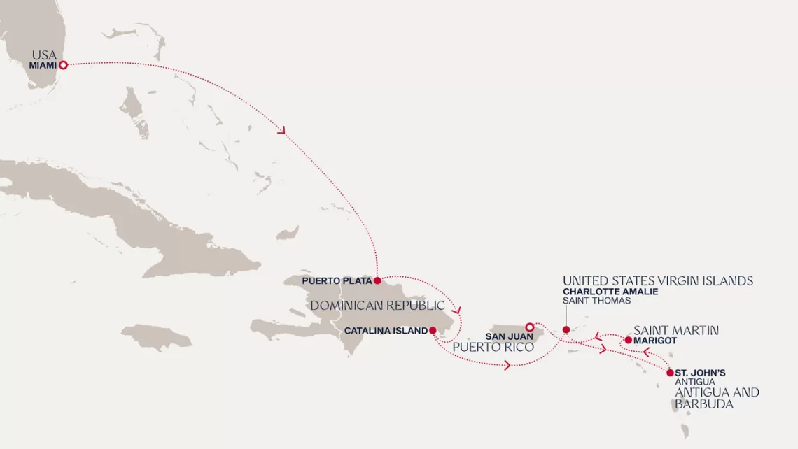 Маршрут круиза: Фор-де-Франс, о. Мартиника - Сент-Джонс, о.Антигуа - Мариго, о. Сен-Мартен - о. Йост-Ван-Дайк - Саут Фрайарс Бэй, о. Сент-Китс - о. Ле-Сент, Гваделупа - Портсмут - Пиджен-Айленд национальный парк, о. Сент- Люсия - Суфриер, о. Сент-Люсия - Архипелаг Тобаго-Кейс - о. Меро - Порт-Элизабет, о. Бекия - о. Юнион - о. Юнион - Фор-де-Франс, о. Мартиника