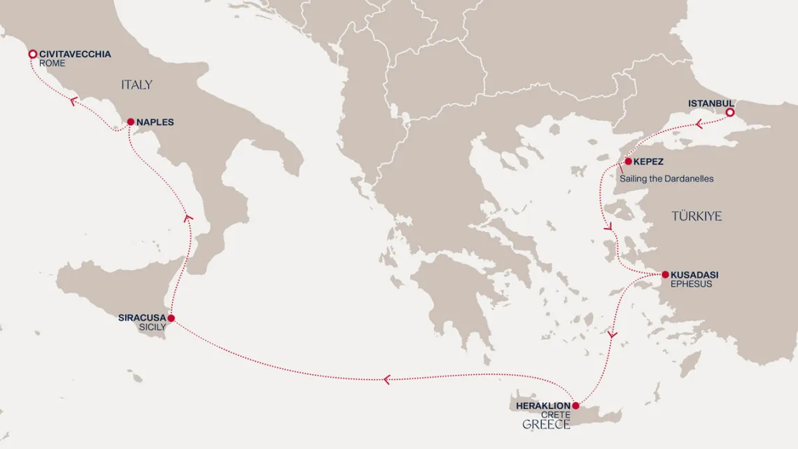 Маршрут круиза: Валлетта - Сиракузы, о. Сицилия - Галлиполи - о. Корфу - Итея - Коринфский канал - о. Идра - о. Парос - о. Патмос - Кушадасы / Эфес - о. Бозджаада - Стамбул