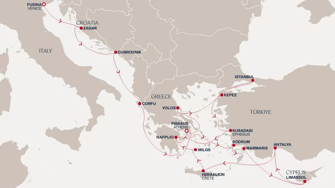 Маршрут круиза: Пирей / Афины - о. Сирос - Бодрум - о. Родос - Ираклион, о.Крит - море - Котор - Галлиполи - Хвар - Риека - Венеция - Задар - Дубровник - о. Корфу - море - Волос - море - Стамбул - Стамбул - Чанаккале - Кушадасы / Эфес - Пирей / Афины