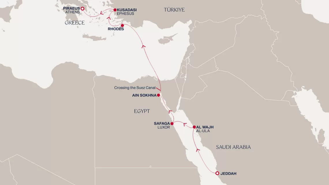 Маршрут круиза: Джидда - Джидда - Эль-Ваджх - Сафага - Сафага - Айн Сохна / Каир - Суэцкий Канал - Суэцкий Канал - море - о. Родос - Кушадасы / Эфес - Пирей / Афины