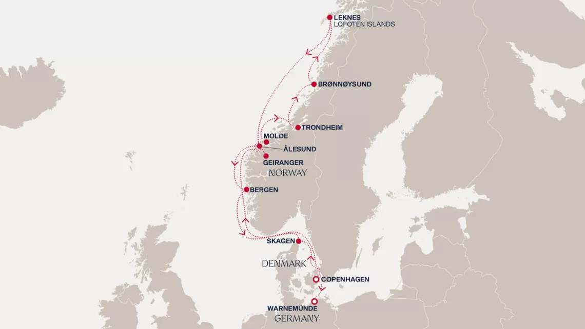 Маршрут круиза: Копенгаген - Скаген - море - Гейрангер - Молде - Тронхейм - Брённёйсунн - Лекнес, Лофотенские острова - море - Олесунн - Берген - море - Копенгаген - Варнемюнде / Берлин