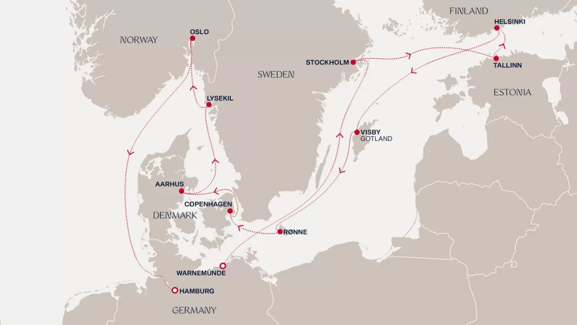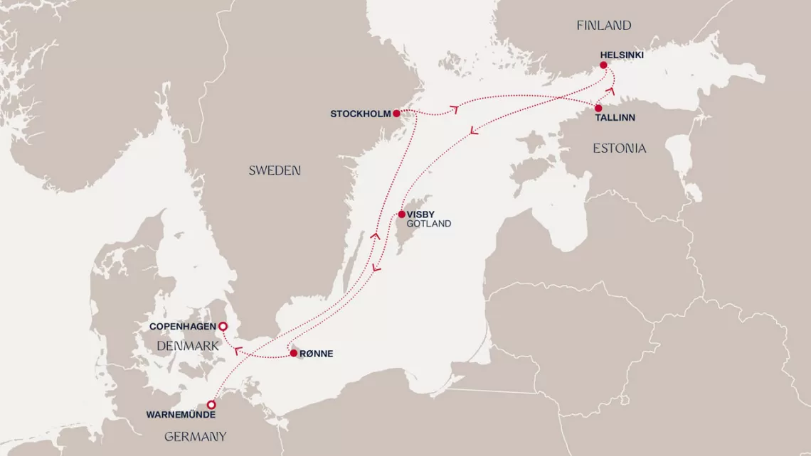 Маршрут круиза: Копенгаген - Варнемюнде / Берлин - море - Стокгольм - Стокгольм - Таллинн - Хельсинки - Висбю, о. Готланд - Рённе - Копенгаген