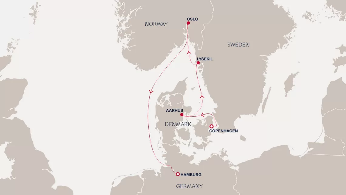 Маршрут круиза: Копенгаген - Орхус - Люсечиль - Осло - море - Гамбург