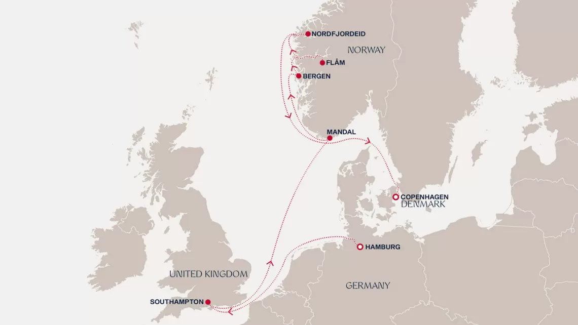 Маршрут круиза: Саутгемптон / Лондон - Зеебрюгге / Брюссель - море - Ставангер - Берген - Нордфьордэйд - Флом - море - Копенгаген