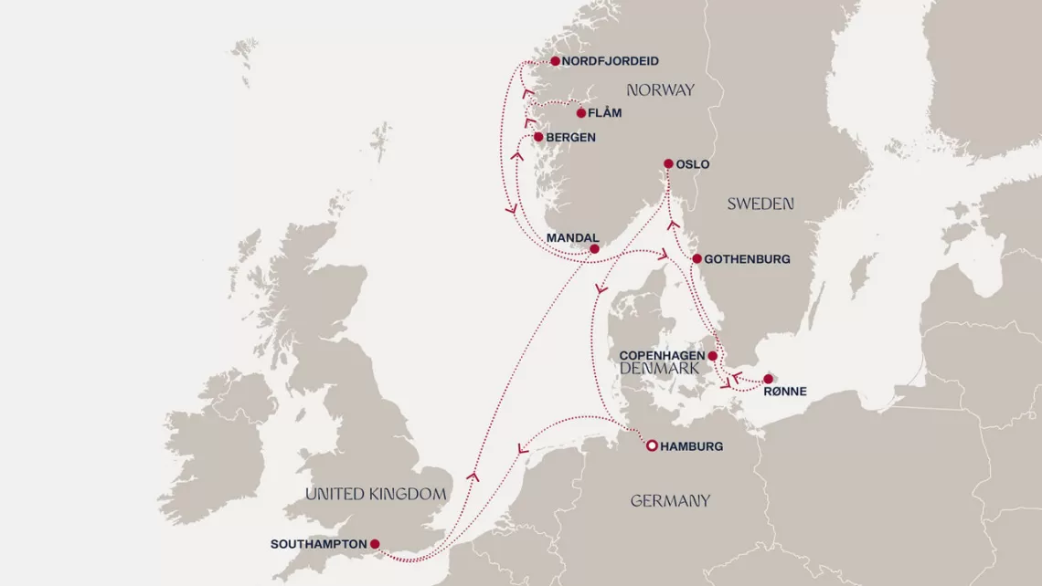 Маршрут круиза: Саутгемптон / Лондон - море - Мандал - Ставангер - Олден - Берген - Флом - море - Копенгаген - море - Таллинн - Стокгольм - Стокгольм - Рига - Висбю, о. Готланд - Рённе - Копенгаген - Орхус - Люсечиль - Осло - море - Гамбург - море - Саутгемптон / Лондон