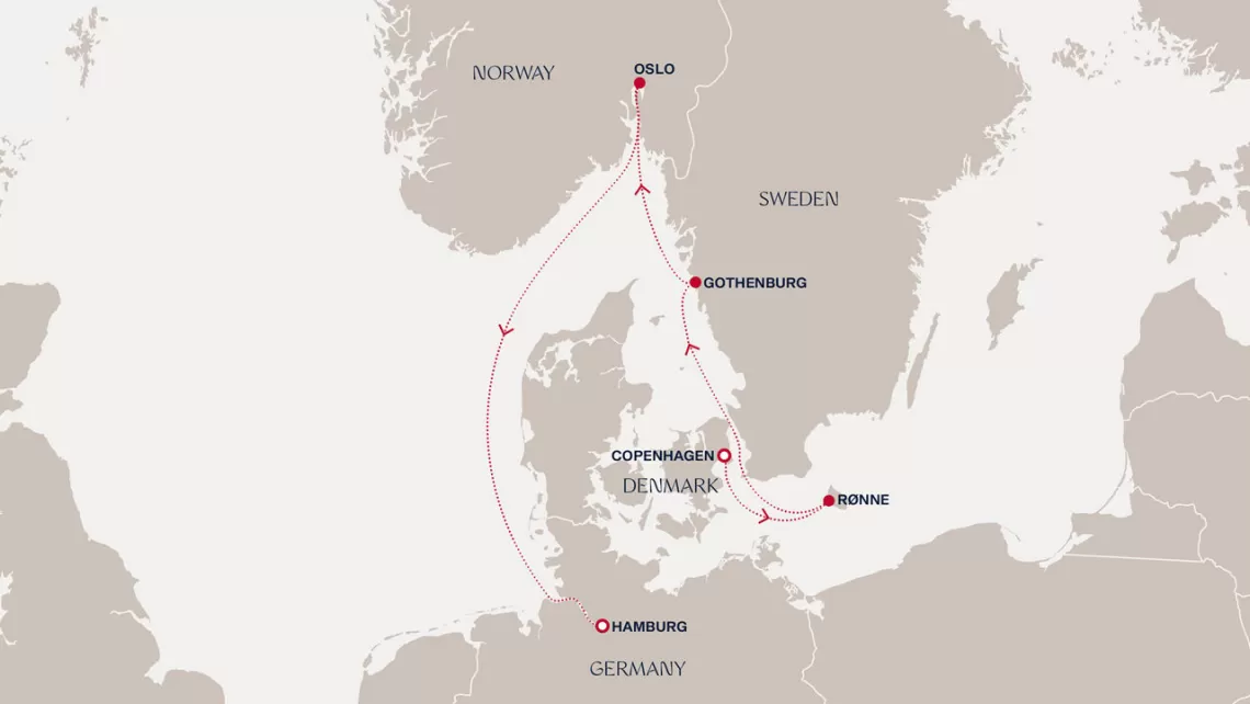 Маршрут круиза: Копенгаген - Варнемюнде / Берлин - море - Эйдфьорд - Берген - Кристиансанн - Осло - Копенгаген - Варнемюнде / Берлин - Рённе - Рига - Висбю, о. Готланд - Стокгольм - море - Копенгаген
