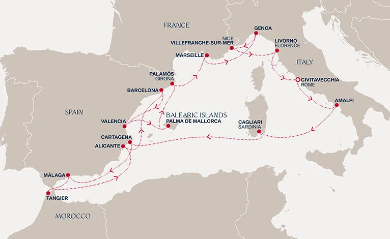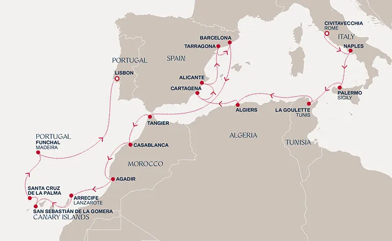 Маршрут круиза: Лас-Пальмас, о. Гран-Канария - Санта-Крус-де-ла-Пальма, о. Ла-Пальма - Санта-Крус-де-Тенерифе, о. Тенерифе - Пуэрто-дель-Росарио, о. Фуэртевентура - Фуншал, о. Мадейра - море - Аресифи, о. Лансароте - Лас-Пальмас, о. Гран-Канария