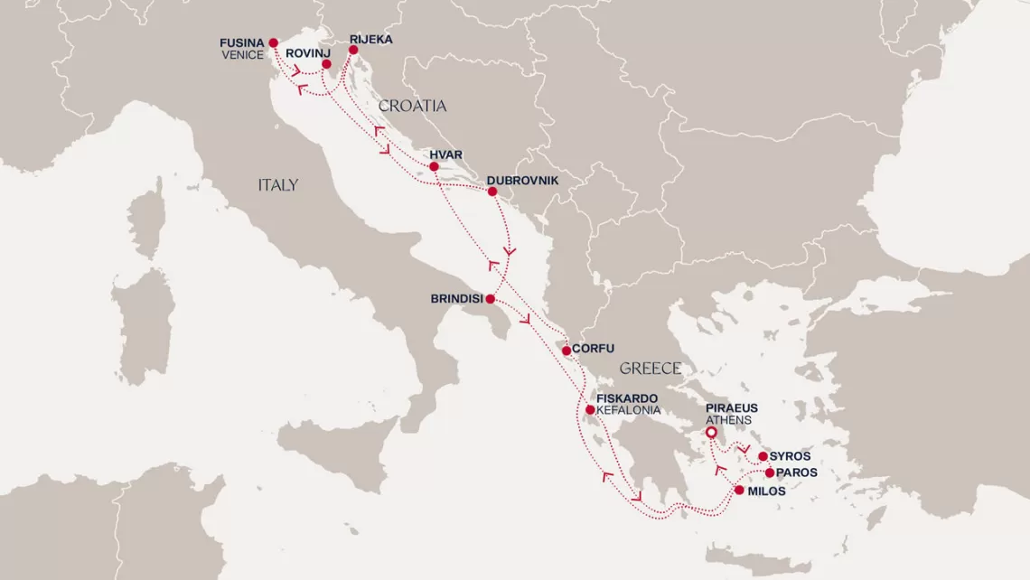 Маршрут круиза: Пирей / Афины - о. Сирос - о. Парос - море - о. Корфу - Хвар - Риека - Венеция - Ровинь - Дубровник - Бриндизи - Фискардо, о. Кефалония - море - о. Милос - Пирей / Афины