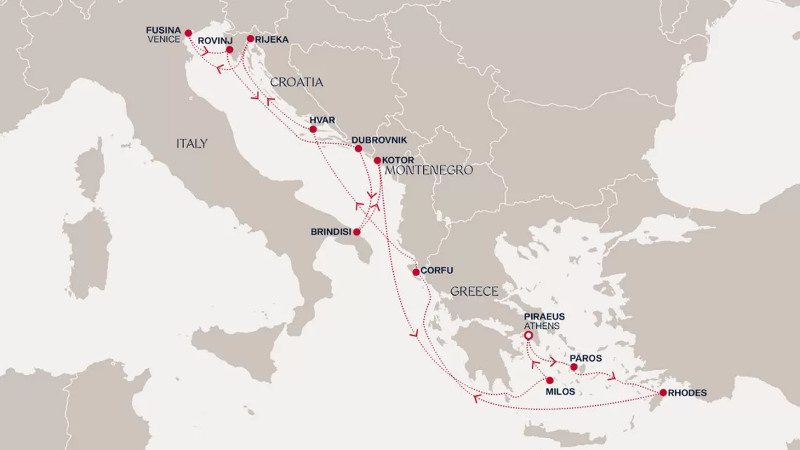Маршрут круиза: Пирей / Афины - о. Парос - о. Родос - море - о. Корфу - Хвар - Риека - Венеция - Ровинь - Дубровник - Бриндизи - Котор - море - о. Милос - Пирей / Афины