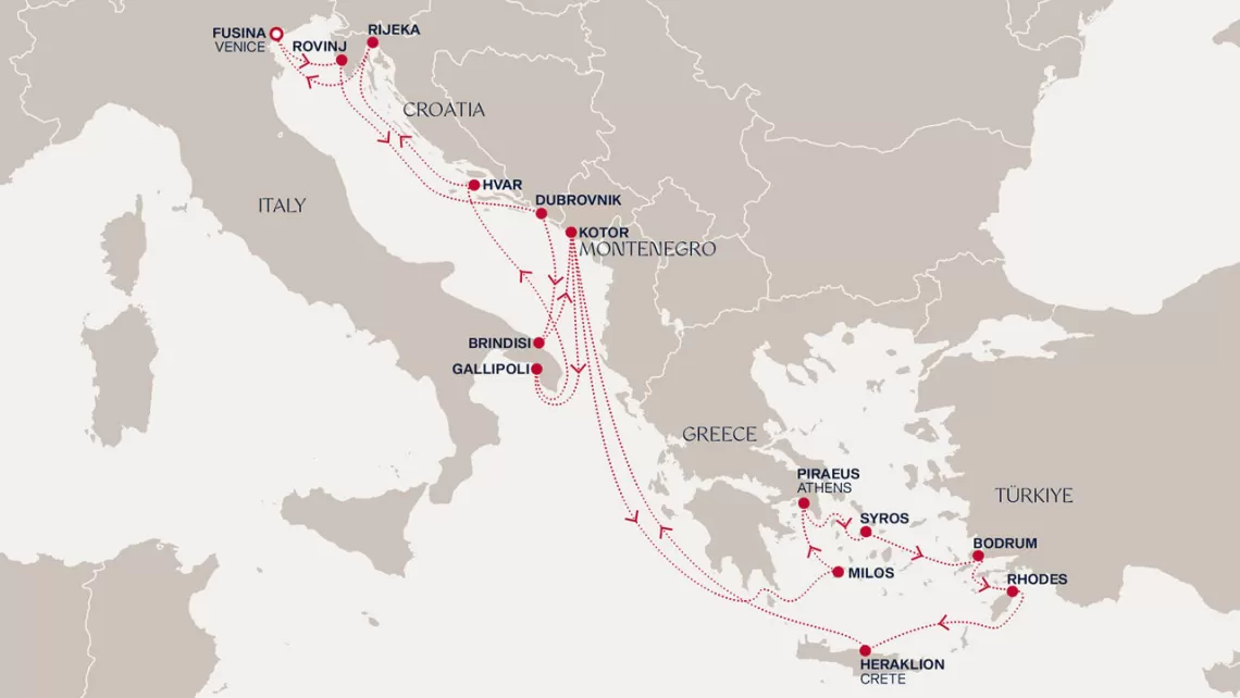 Маршрут круиза: Венеция - Ровинь - Дубровник - Бриндизи - Котор - море - о. Милос - Пирей / Афины - о. Сирос - Бодрум - о. Родос - Ираклион, о.Крит - море - Котор - Галлиполи - Хвар - Риека - Венеция