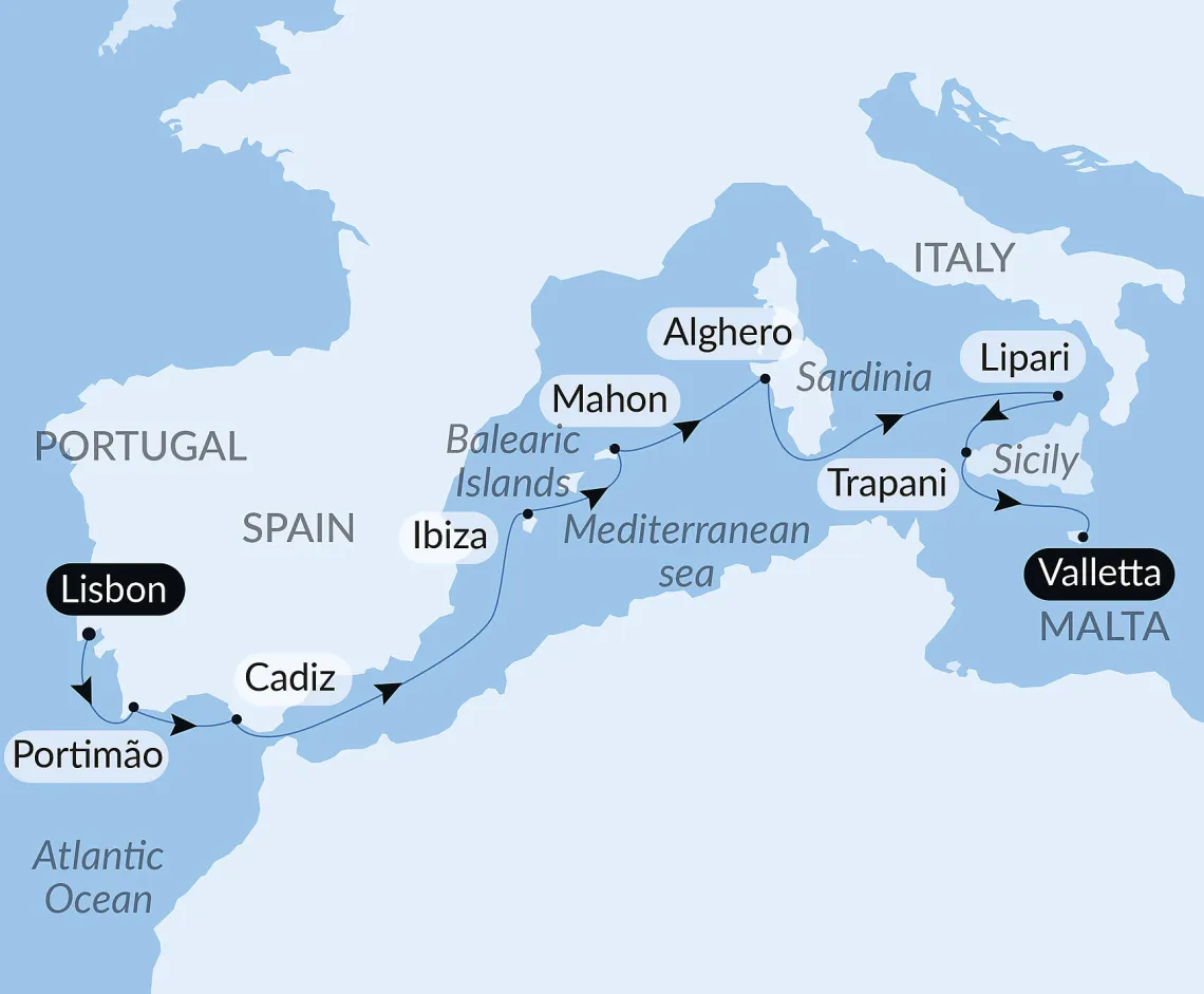 Маршрут круиза: Валлетта - Порт Эмпедокле, о. Сицилия - Трапани, о. Сицилия - Палермо, о. Сицилия - о. Липари - о. Стромболи - Салерно - Реджо-ди-Калабрия - Таормина, о. Сицилия - Сиракузы, о. Сицилия - Валлетта