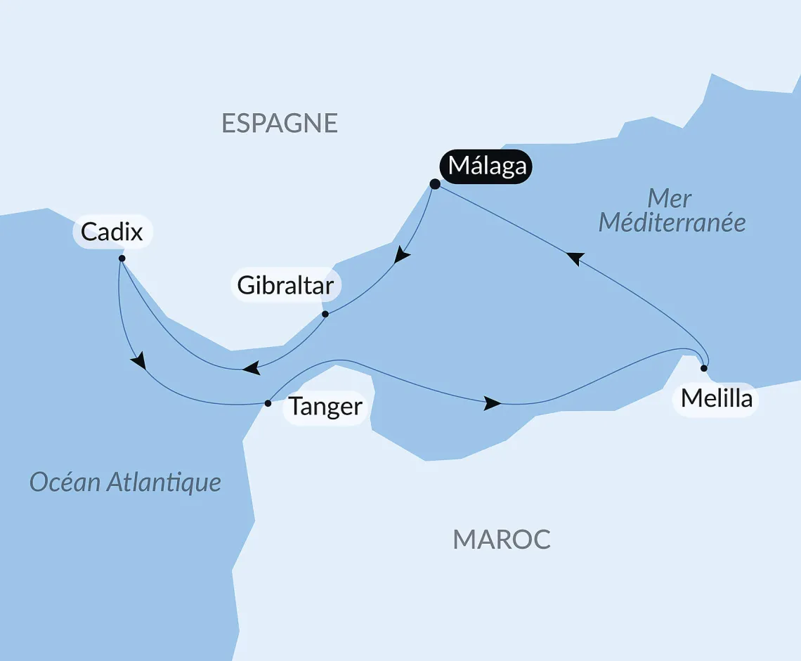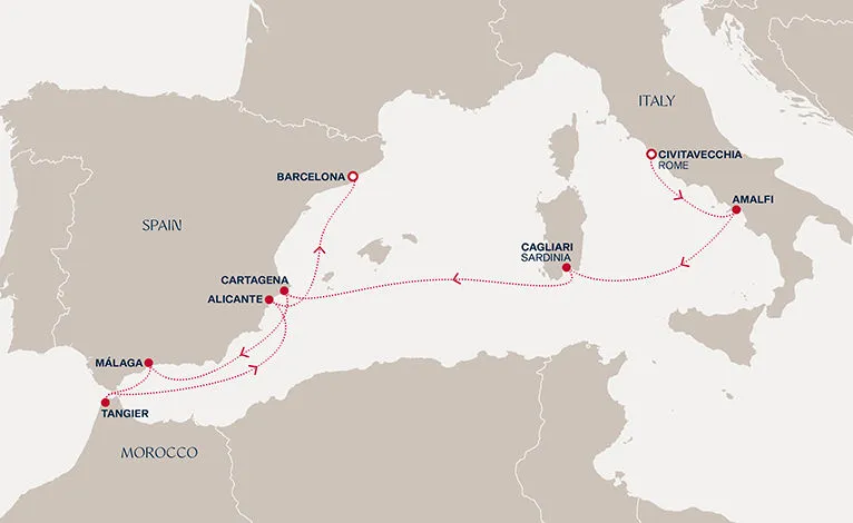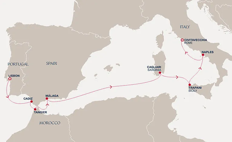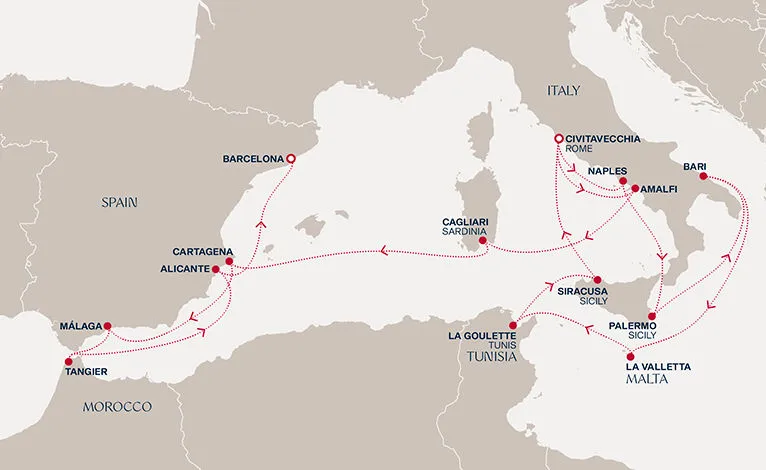 Маршрут круиза: Чивитавеккья / Рим - Ливорно / Флоренция, Пиза - Генуя / Милан - Марсель - Барселона - море - Танжер - море - море - море - море - море - море - море - Сент-Джонс, о.Антигуа - Филипсбург, о. Синт-Мартен - Бастер, о. Сент-Китс - море - Ла-Романа - о. Каталина - море - Бриджтаун, о. Барбадос - Фор-де-Франс, о. Мартиника - Пуант-а-Питр, о. Гваделупа - Род-Таун, о. Тортола - Ла-Романа