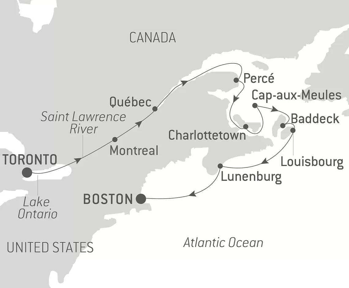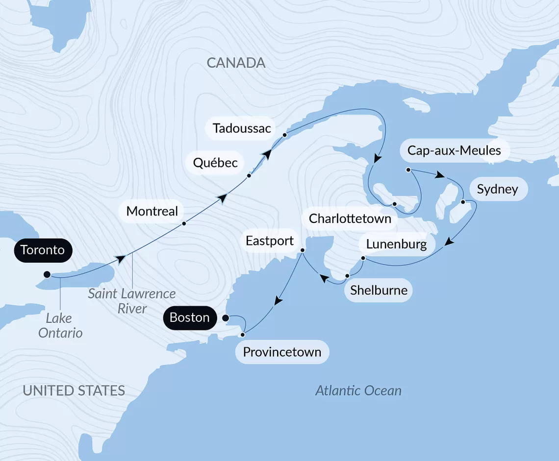 Маршрут круиза: Торонто - озеро Онтарио - Сент-Лоуренс река - Монреаль - Квебек - Тадуссак - море - Шарлоттаун - Кап-о-Мёль - Сидней - Луненберг - море - Провинстаун - Бостон