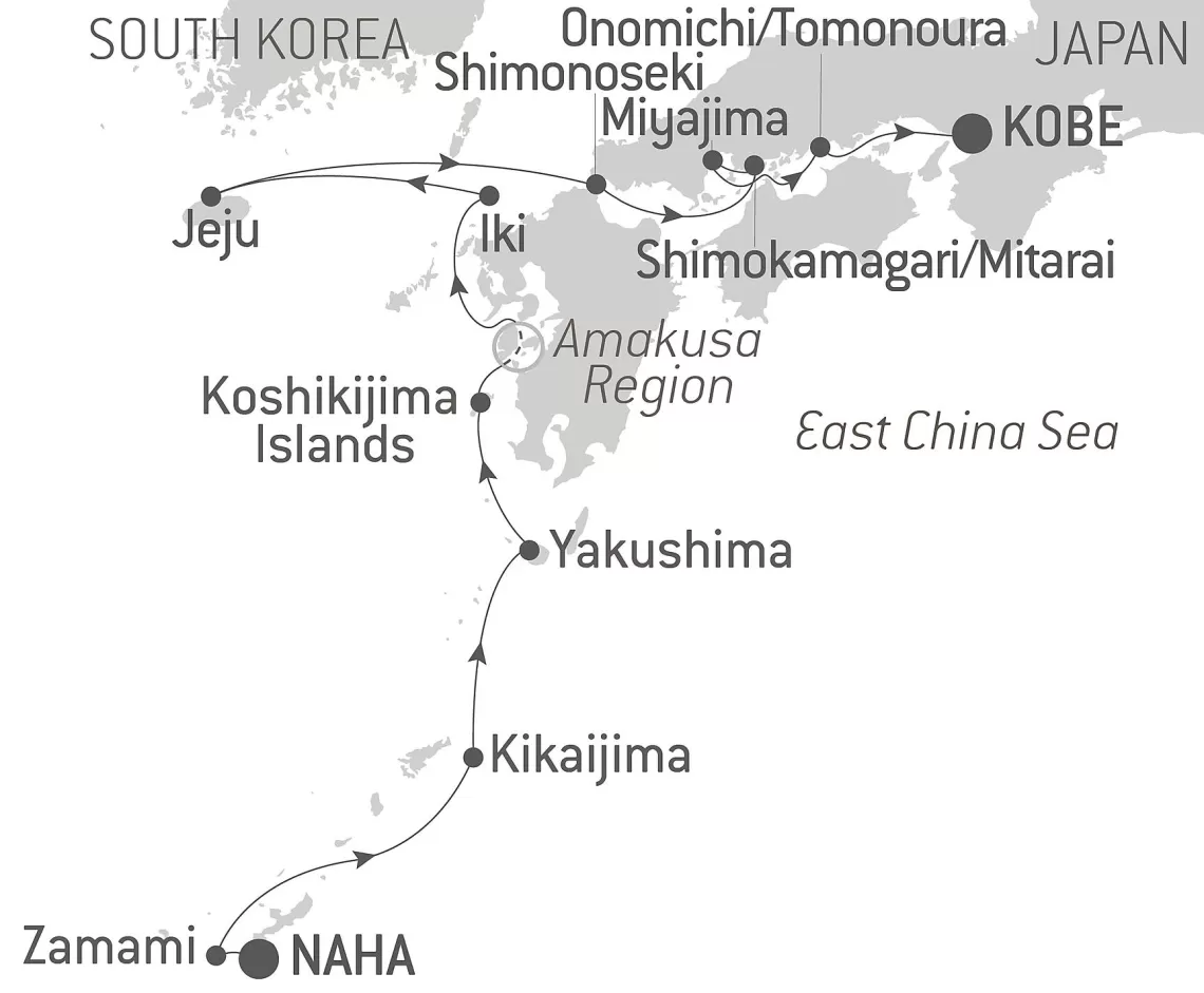 Маршрут круиза: Наха - о. Замами - Кикайдзима - Мияноура - острова Кошики - регион Амакуса - остров Ики - Чеджудо - Симоносеки - море - Митарай - остров Симо-Камагари - о. Ицукусима - Ономити - Томоноура - Кобе