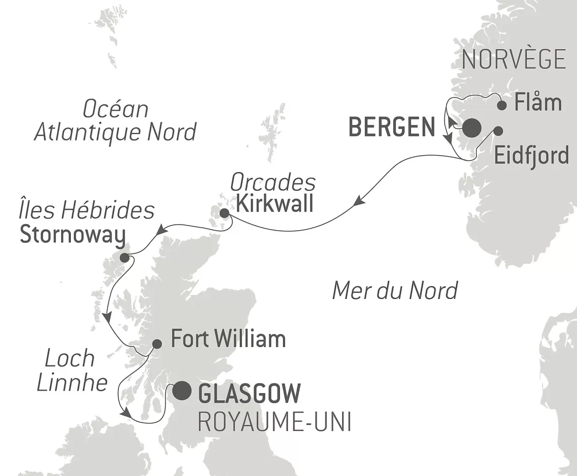 Маршрут круиза: Гринок / Глазго - Белфаст - Форт-Уильям - озеро Лох-Линне - Сторновей - Сувурой - Торсхавн, о. Стреймой - Фарерские острова - Торсхавн, о. Стреймой - Джьюпивогюр - Вестманнаэйяр архипелаг - Вестманнаэйяр архипелаг - Рейкьявик - Рейкьявик