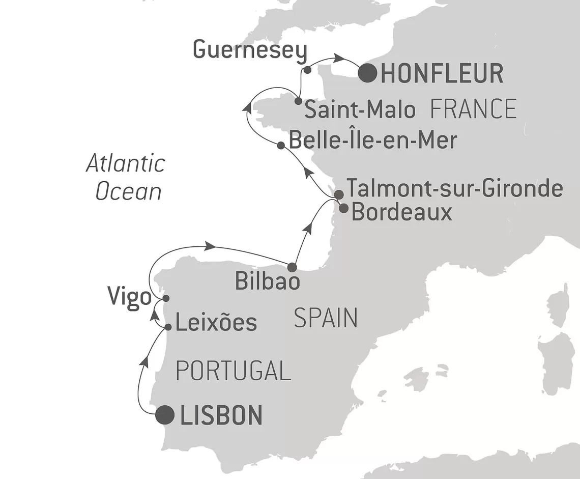 Маршрут круиза: Лиссабон - Лейшойнш - Виго - море - Бальбоа - море - Бордо - Тальмон-Сюр-Жиронд - Ле Пале, о. Бель-Иль - Сен-Мало - остров Херм - Онфлёр