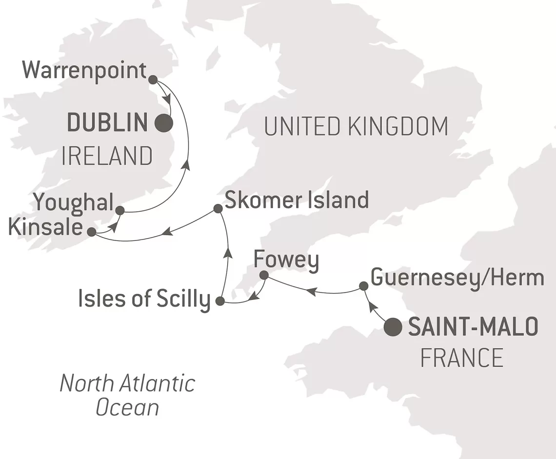 Маршрут круиза: Сен-Мало - о. Гернси - остров Херм - Фоуи - Треско, о.Силли - о. Скомер - Кинсейл - Йол - Уорренпойнт - Дублин