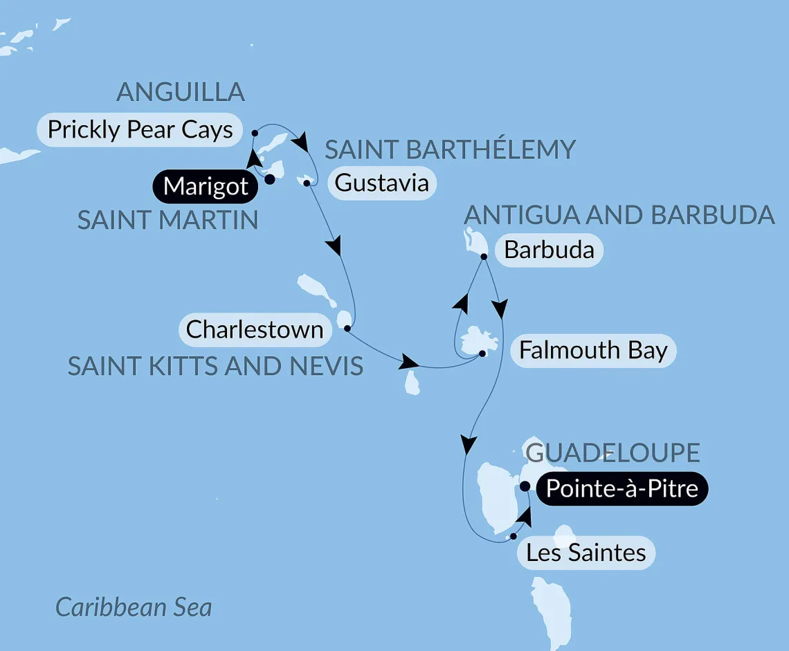 Маршрут круиза: Пуант-а-Питр, о. Гваделупа - о. Ле-Сент, Гваделупа - Фалмут, о.Антигуа - о. Барбуда - Густавия, о. Сен-Бартельми - Чарлстаун, о. Невис - о. Прикли Пэр Кейс - Роуд Бэй, о. Ангилья - море - Мариго, о. Сен-Мартен
