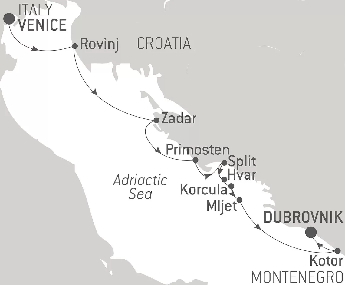 Маршрут круиза: Венеция - Ровинь - Задар - Примоштен - Сплит - Хвар - Корчула - о. Млет - Тиват - Дубровник