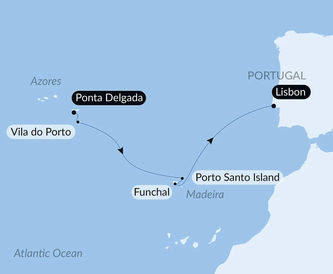 Маршрут круиза: Понта-Делгада, о.Сан-Мигел - Понта-Делгада, о.Сан-Мигел - Вила-ду-Порту, о. Санта - Мария - море - Порто Санто, о. Мадейра - Фуншал, о. Мадейра - Фуншал, о. Мадейра - море - Лиссабон