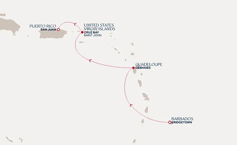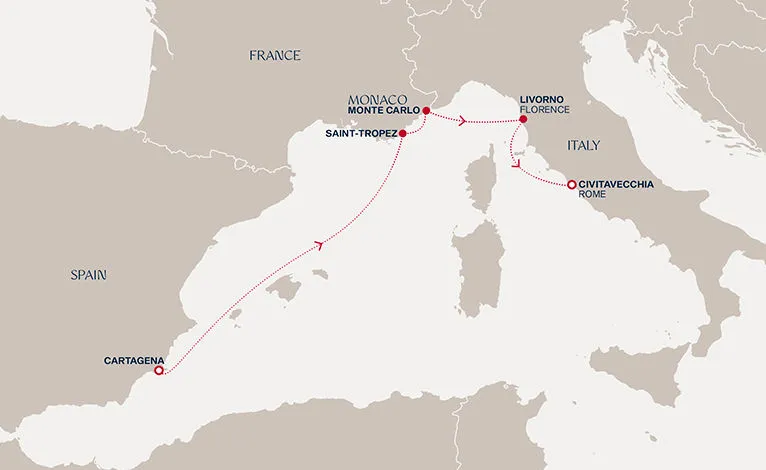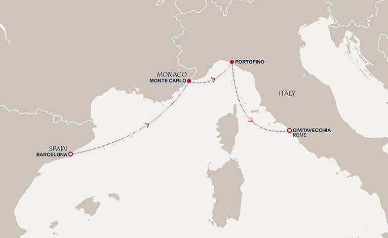 Маршрут круиза: Чивитавеккья / Рим - Аяччо, о. Корсика - Марсель - Барселона - море - море - Пуэрто-дель-Росарио, о. Фуэртевентура - Санта-Крус-де-Тенерифе, о. Тенерифе - море - море - море - море - море - море - Филипсбург, о. Синт-Мартен - Бастер, о. Сент-Китс - Кингстаун, о. Сент-Винсент - Бриджтаун, о. Барбадос - Сент-Джорджес, о. Гренада - море - Фор-де-Франс, о. Мартиника