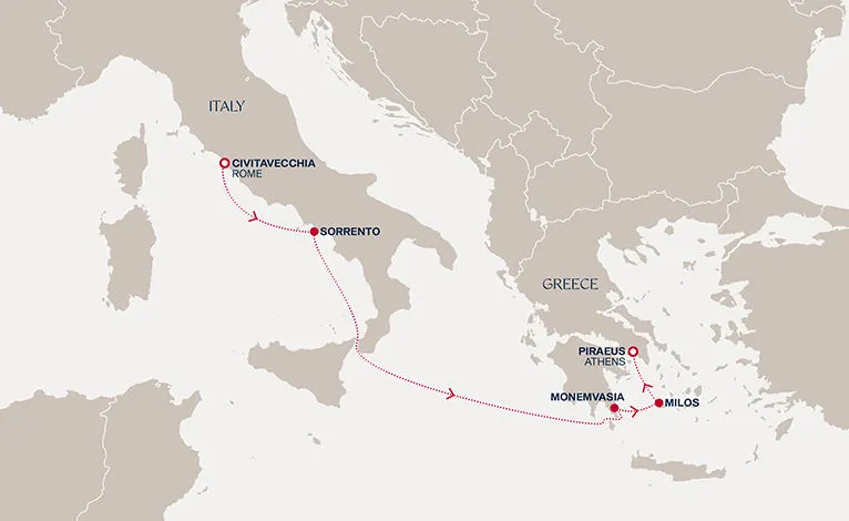 Маршрут круиза: Чивитавеккья / Рим - Генуя / Милан - Марсель - Барселона - море - Гибралтар - Касабланка - море - море - море - Минделу, о. Сан-Висенте - море - море - море - море - Сальвадор - море - Рио-де-Жанейро - Рио-де-Жанейро - море - море - Буэнос-Айрес - Буэнос-Айрес - море - море - Пуэрто-Мадрин - море - Порт-Стэнли - море - море - Ушуайя - Ушуайя - море - море - Пуэрто-Монт - море - Вальпараисо / Сантьяго - Вальпараисо / Сантьяго - море - море - море - море - Ханга-Роа, о. Пасхи - море - море - Баунти-Бэй - море - море - Папеэте, о.Таити - Папеэте, о.Таити - о. Муреа - море - Атолл Аитутаки - о. Раротонга - море - море - море - море - море - Бэй-оф-Айлендс - Окленд - Тауранга - море - Литтелтон / Крайстчерч - Данидин - Милфорд-Саунд - море - Хобарт - Хобарт - море - Сидней - Сидней - море - море - Нумеа - море - Луганвилл - море - море - море - Апиа, о. Уполу - Паго-Паго, о. Тутуила - море - море - море - море - море - Гонолулу, о. Оаху - Хило, о. Биг-Айленд - море - море - море - море - море - Лос-Анджелес - море - море - Кабо-Сан-Лукас - море - море - море - Пунтаренас - Панамский канал - море - Панамский канал - море - Очо-Риос - море - море - Род-Таун, о. Тортола - Филипсбург, о. Синт-Мартен - море - море - море - море - море - море - Лас-Пальмас, о. Гран-Канария - море - море - о. Майорка - море - Неаполь / Помпеи - Чивитавеккья / Рим