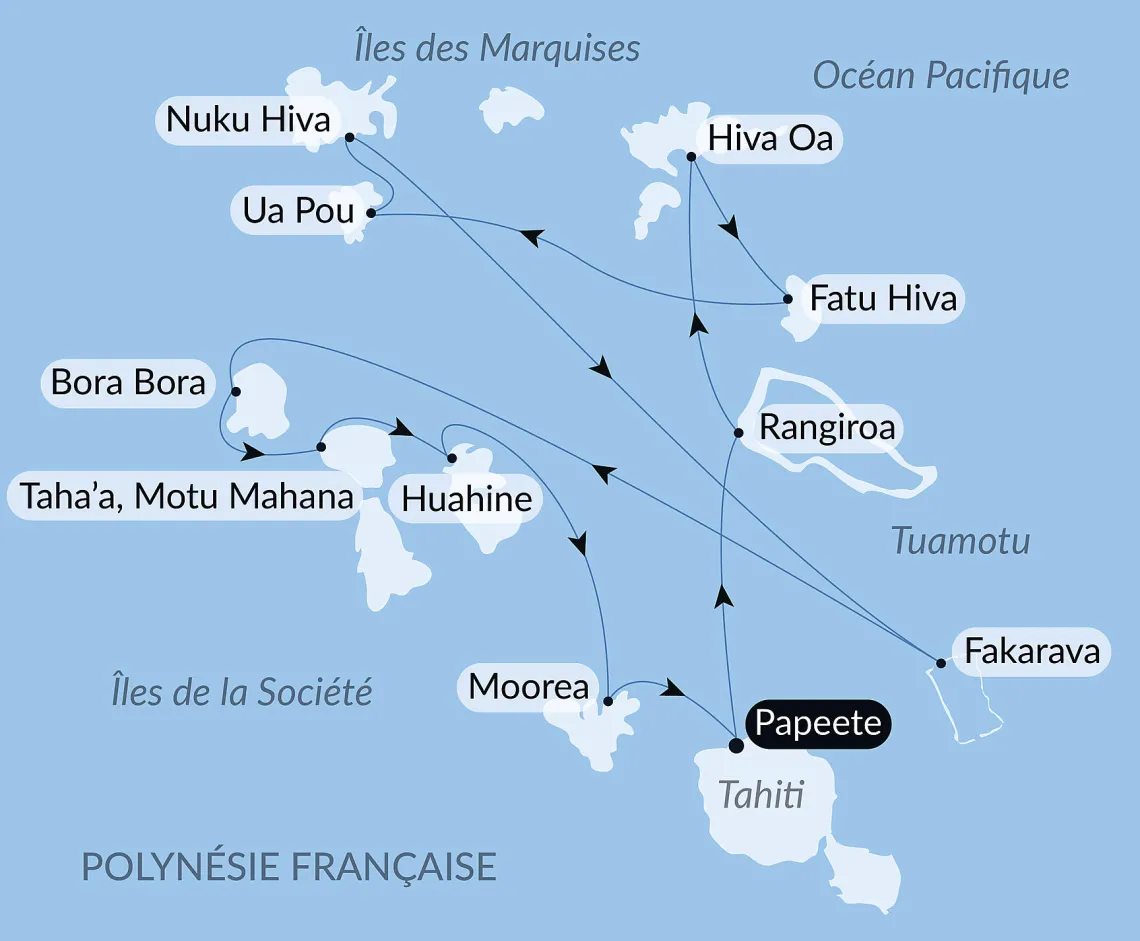 Маршрут круиза: Папеэте, о.Таити - о. Рангироа - море - Атуона, о. Хива-Оа - Омоа, о. Фату-Хива - Хакахау, о. Уа Поу - Тайоа, о. Нуку-Хива - море - о. Факарава - море - о. Бора-Бора - о. Тахаа - о. Хуахине - о. Муреа - Папеэте, о.Таити