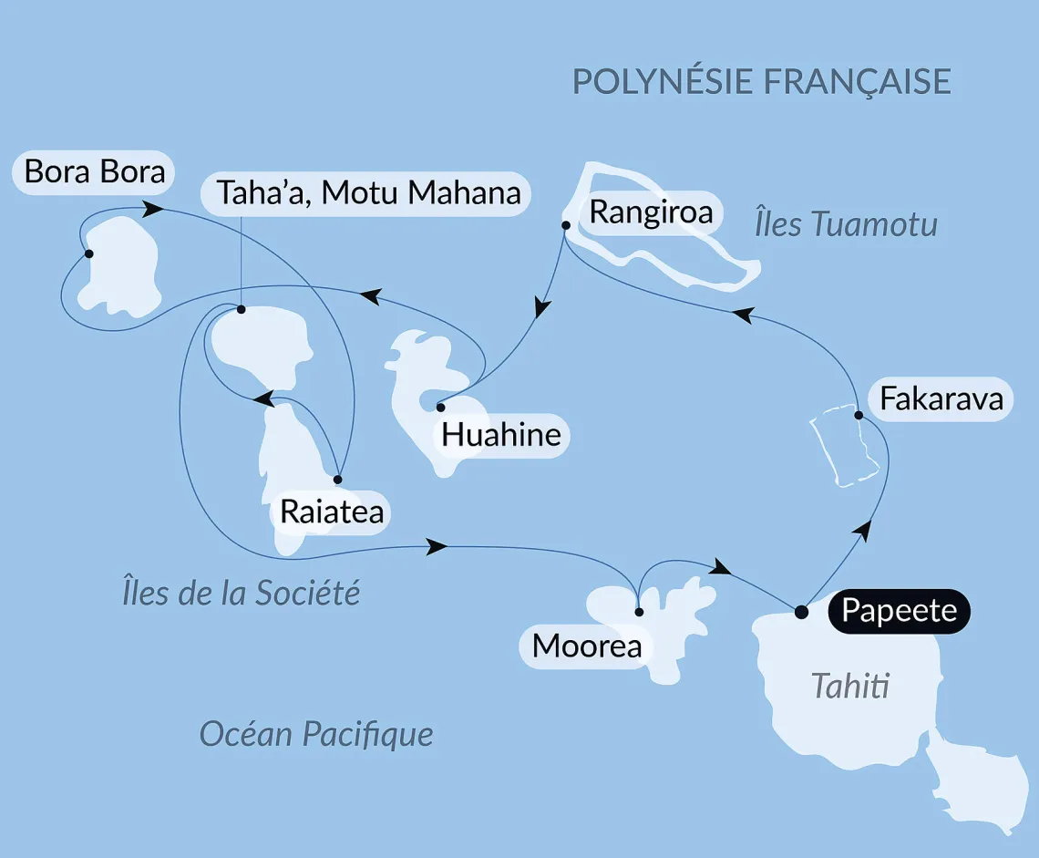 Маршрут круиза: Папеэте, о.Таити - о. Хуахине - о. Райатеа - о. Тахаа - о. Бора-Бора - о. Бора-Бора - море - о. Факарава - о. Рангироа - о. Муреа - о. Муреа - Папеэте, о.Таити - Папеэте, о.Таити