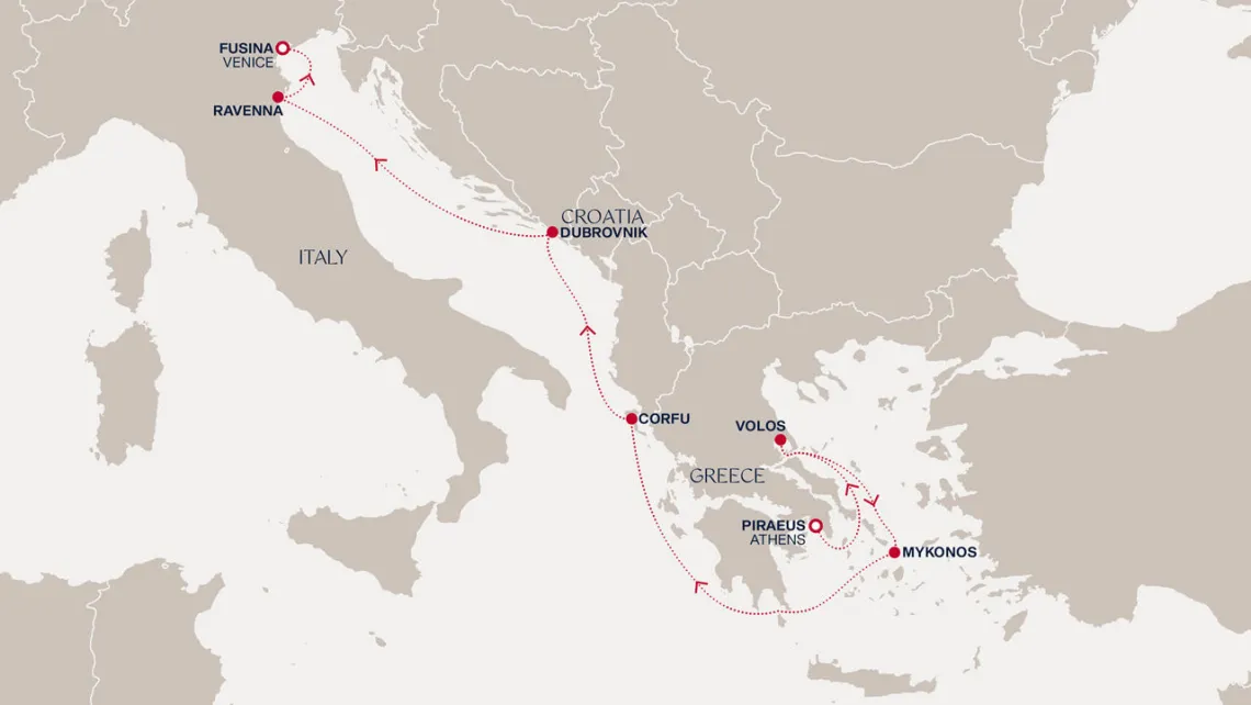 Маршрут круиза: Пирей / Афины - Волос - о. Миконос - море - о. Корфу - Дубровник - Равенна - Венеция