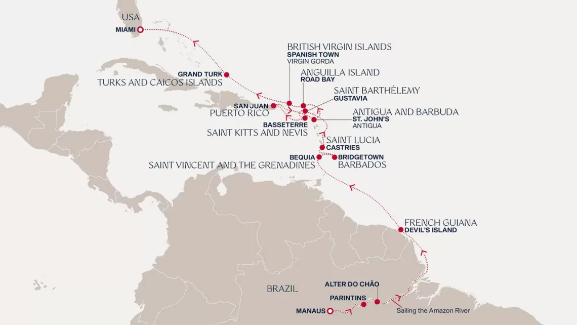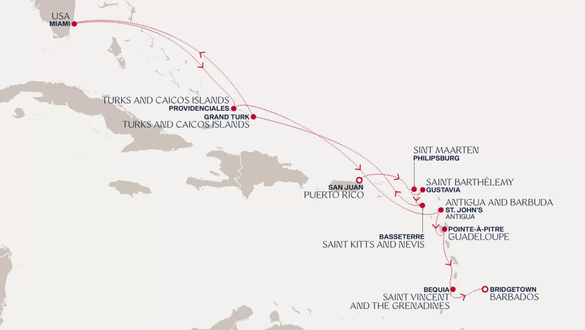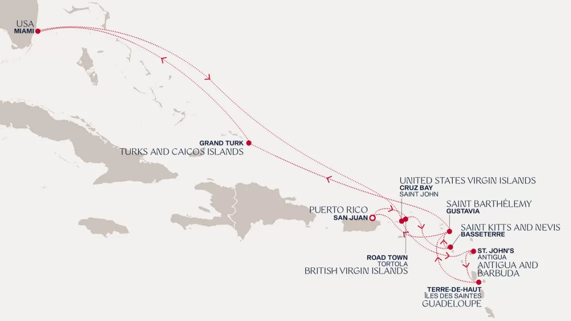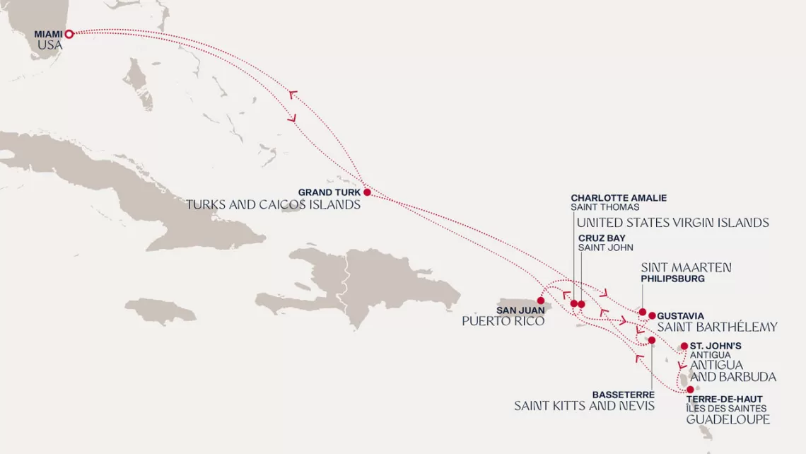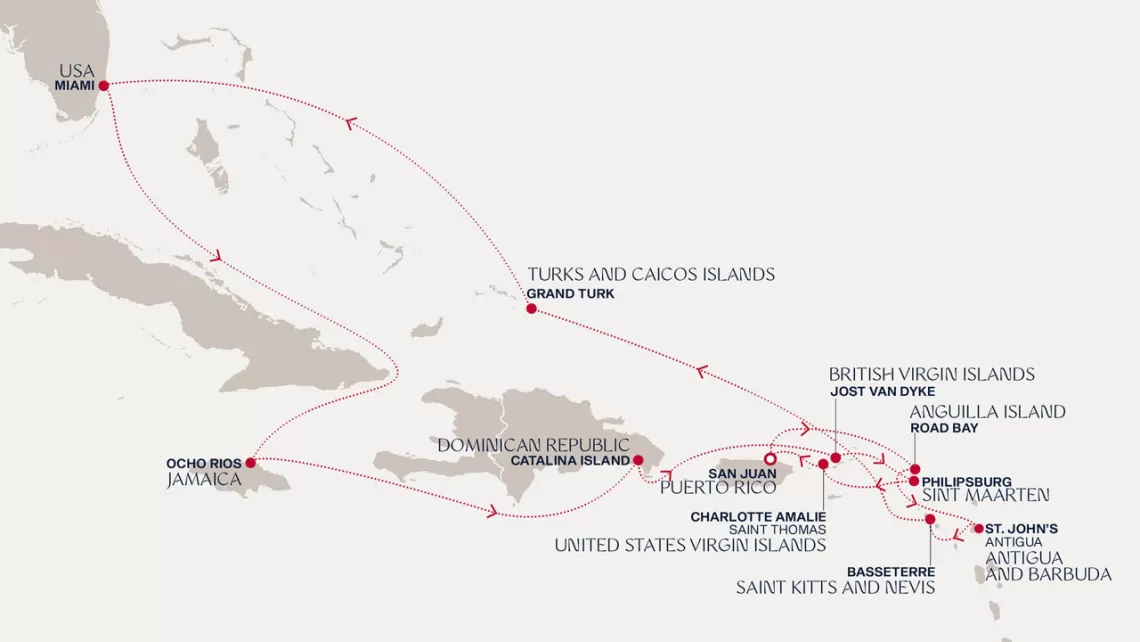 Маршрут круиза: Майами - море - море - о. Сент-Джон - Сент-Джонс, о.Антигуа - о. Тер-де-О, Гваделупа - Шарлотта-Амалия, о. Сент-Томас - Сан-Хуан - Филипсбург, о. Синт-Мартен - Густавия, о. Сен-Бартельми - Густавия, о. Сен-Бартельми - Бастер, о. Сент-Китс - море - о. Гранд-Терк - море - Майами