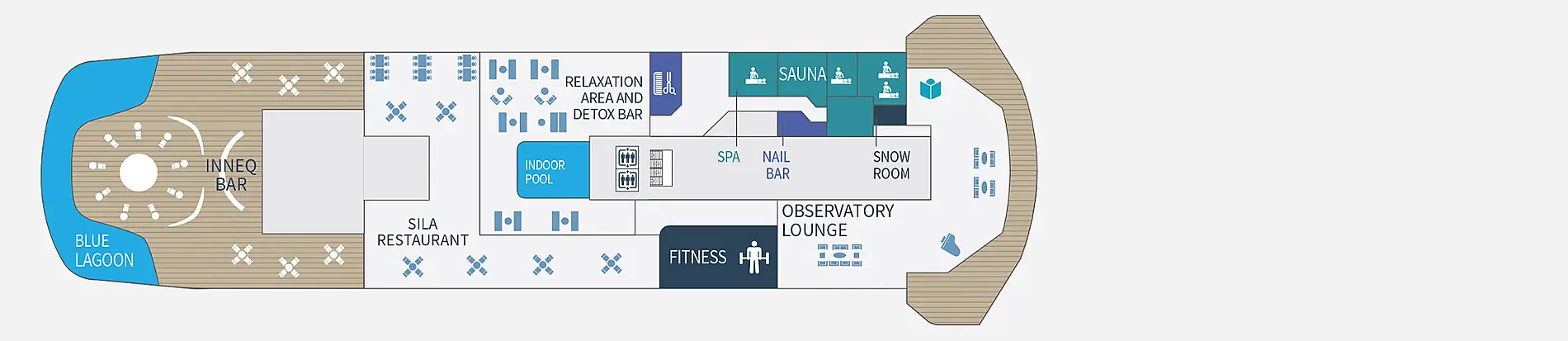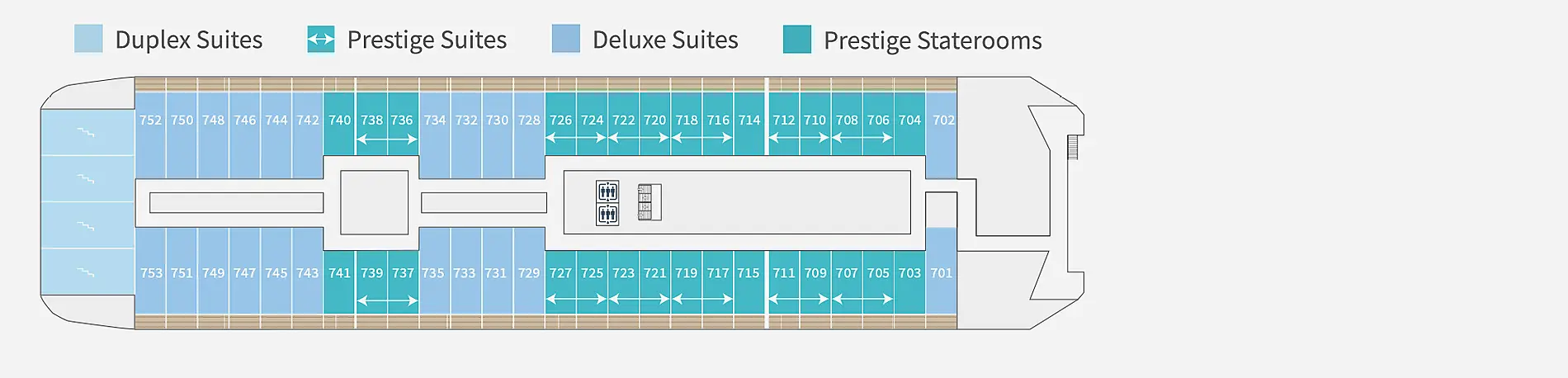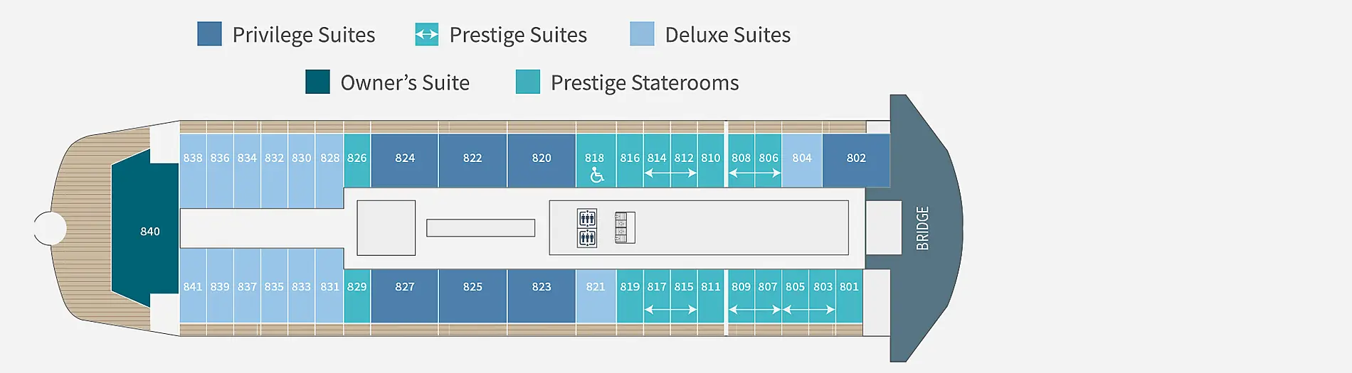 Расположение каюты можно посмотреть на плане палуб во вкладке "Круизный лайнер" на странице выше. Первые цифры номера каюты - номер палубы. Каюты отмеченные "для инвалидов" могут быть заменены MSC на каюту той же категории с другим расположением на лайнере без согласования с Клиентом.